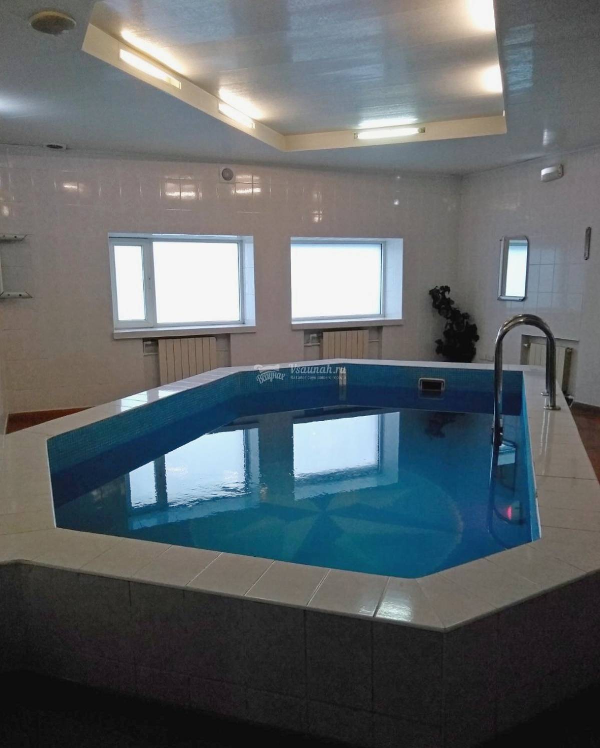 Сауна при гостинице, на 8 персон, теплый бассейн, просторная комната отдыха с обеденным столом и мягкой зоной.